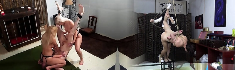 Pegging doms fuck strapon sissy in gang