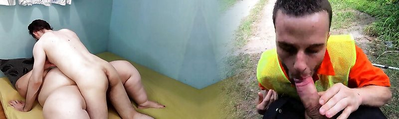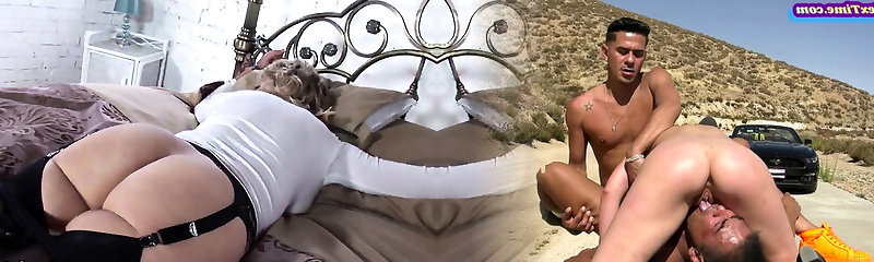 Skinny guy gets dick sucked by a chunky dark-haired in corset