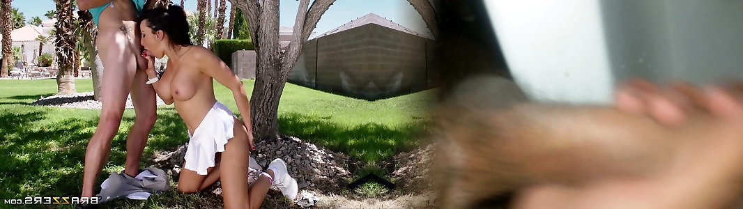 Marvelous dark haired Milf Lezley Zen gives a head to her man outdoors