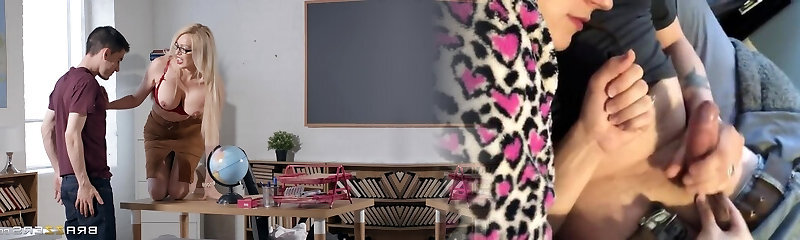Mature blond with glasses Amber Jayne inhales and rides for a cumshot