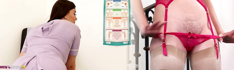 Sexy nurse in stockings and sexy uniform Cherry Blush demonstrates off her plump bootie