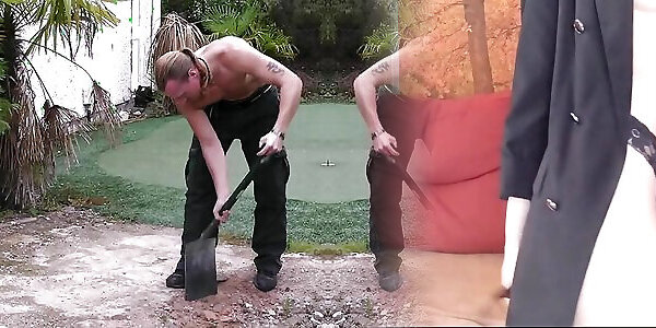 Plumper blonde in lingerie seduces garden worker