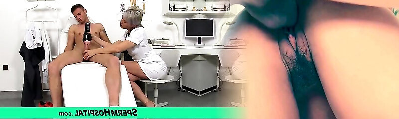 Nurse in black pantyhose wanks him off on her gorgeous legs
