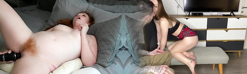 Big-chested MILF and young redhead eat each other's fuckboxes