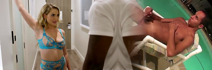 Blake Blossom wears blue lingerie while screwing with a black guy