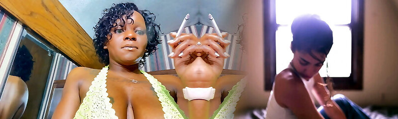 chubby girl smoking while toying with her massive tits