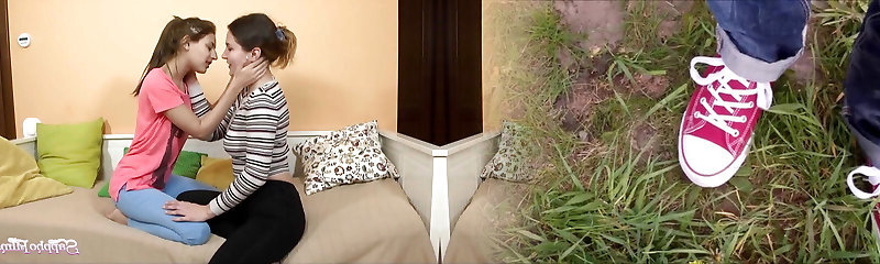 Smooching HD Tiny teen and busty lesbian all over each other smooching deeply
