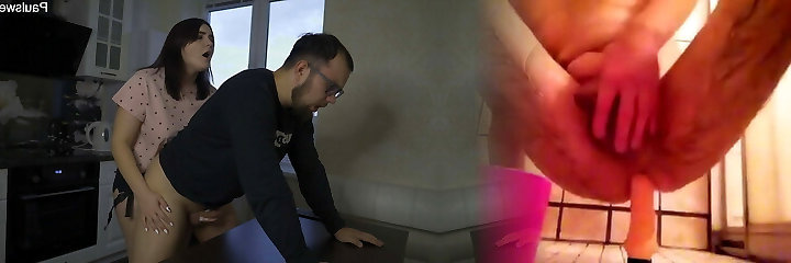 Big strapon in the butt and a lot of cum on the table